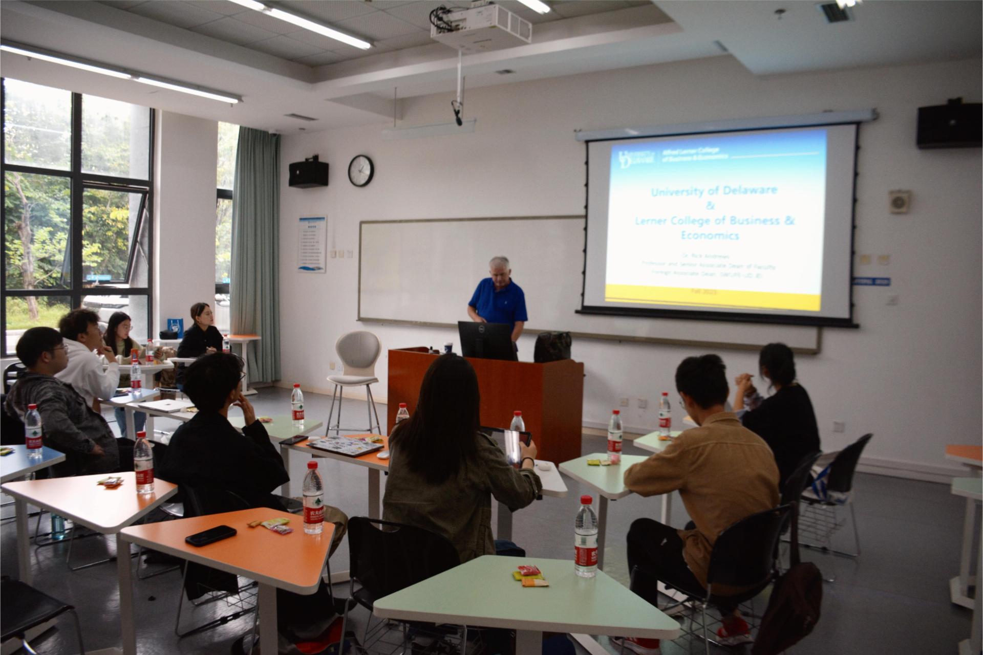 10月17日,Rick Andrews教授讲述了自己的求学经历,首先介绍了有关特拉华大学的信息,从特拉华大学的课程开设、校园环境、学校历史展开叙述。他讲述了特拉华大学作为美国第一个开设海外交流项目的大学,在这方面有充足经验并且成果颇丰,讲解了适合西财本科学生的特拉华大学交流交换以及硕士项目并详细介绍了特拉华大学的强势学科和专业。教授作为第一代大学生,求学经历并不简单。经过他自己的摸索,认识到教育对人生轨迹改变的重要性,并且一直在学科研究方向深掘。在工作后,他致力于国际间学术交流以及研究,在印度、中国等国家广泛旅行。