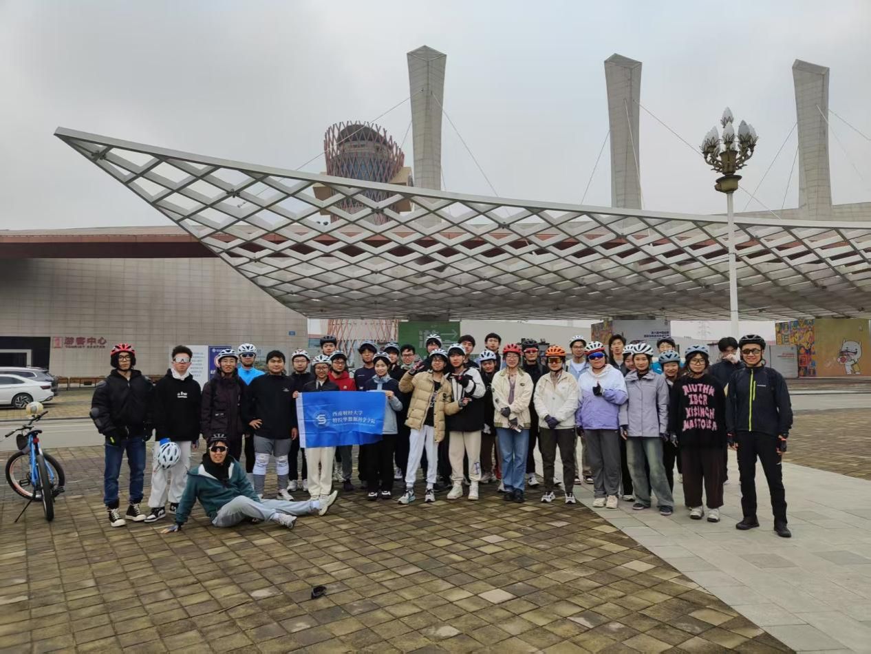 在专业骑行人员讲解完注意事项和做完热身活动后,33名特院学子在学院院长杨石磊、副院长兼党总支副书记王彬宇,以及特拉华大学陶庆久、曹锦薇、张乐婷等老师的组织和带领下从学校南门出发,开启了本次的骑行之旅。