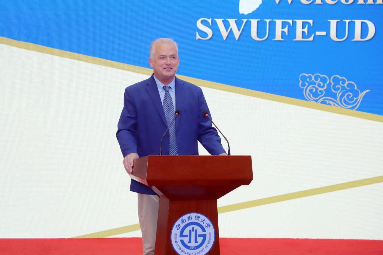 美方副院长Rick Andrews在致辞中表示非常欢迎2023级新同学加入特院,也期待同学们到特拉华大学交流学习。他指出,特拉华大学将继续深化与西南财经大学的合作,他也将定期来到西财与同学和同事会面,以确保课程质量达到最高水平,确保特拉华大学与西南财经大学的合作顺利进行。