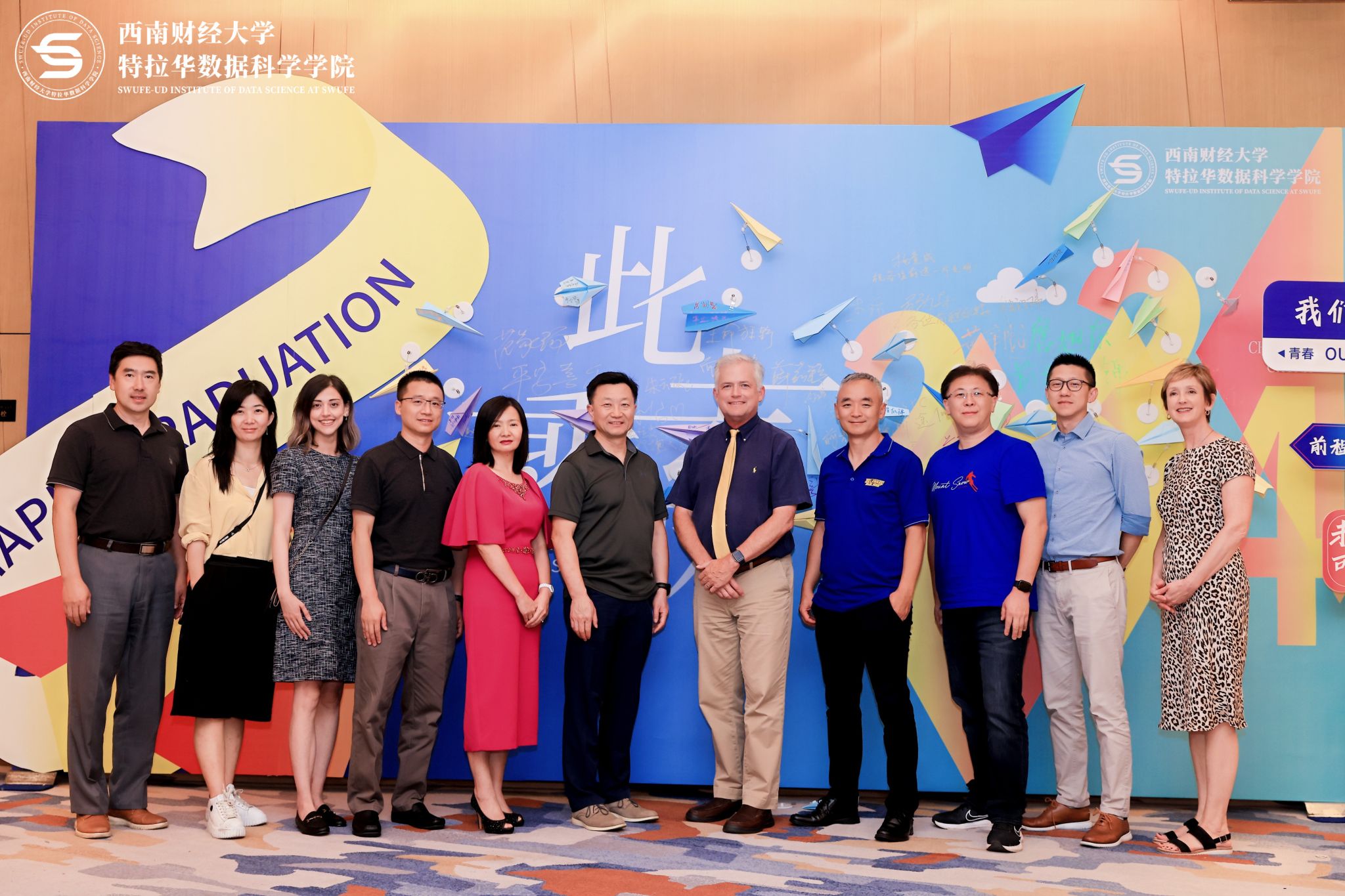 院长杨石磊、党总支书记王学钊、副院长兼党总支副书记王彬宇、学院项目主任廖毅、王宇、王磊、美国特拉华大学勒纳商学院院长Oliver Yao、资深副院长兼多多彩票