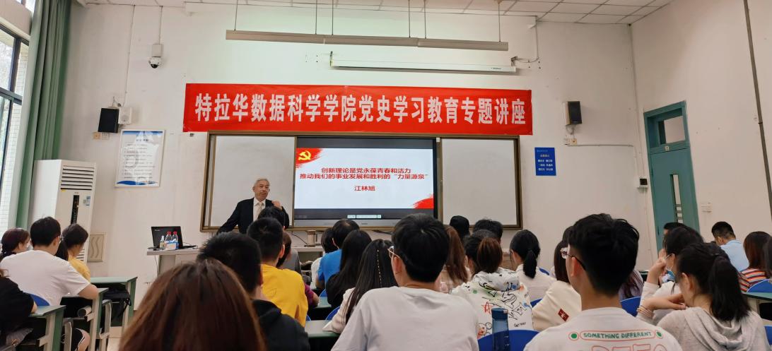 江林旭老师以“理论创新是党永葆青春和活力,推动我们的事业发展和胜利的‘力量源泉’”为题,紧紧围绕“党的理论创新问题提出、理论创新的一般认知、党的百年历史中理论创新和实践创新、中国高校应成为理论创新的先驱”四个方面作了精彩讲授。在回顾党的100年历史中,他通过详实的历史资料、生动的语言风格,解读了我们党如何在实践中不断丰富和发展马克思主义,诠释了“我们党的历史,就是一部不断推进理论创新、进行理论创造的历史”。